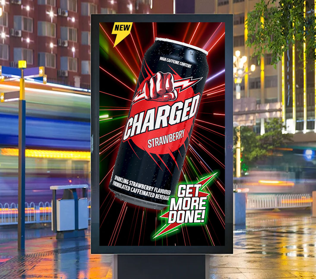 Quick and fun DOOH for launch of Charged, a new energy drink from the Coca-Cola Company. We made a version with sound for social reels.